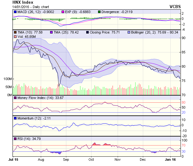 HNX-Index điều chỉnh giảm mạnh sau phiên giao dịch trong biên độ hẹp ngày 13/1. Chỉ số này mất 1,24%, lùi xuống dưới mốc hỗ trợ 76 điểm với thanh khoản tăng cao do áp lực bán tháo xuất hiện. Với việc giảm xuống dưới mốc 76 điểm, HNX-Index cũng đã phá vỡ mốc Fibo61.8% và dự kiến áp lực điều chỉnh sẽ tiếp tục mạnh dần lên trong các phiên tới.