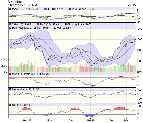 Thêm vào đó, các chỉ báo kỹ thuật như MACD và RSI đang đi lên tích cực, cho thấy chỉ số có thể có cơ hội tiến lên thử thách vùng kháng cự 1.020-1.025 điểm (vùng đỉnh tháng 10/2018) trong những phiên tới.