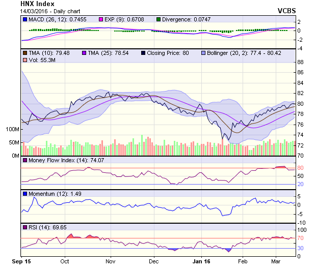 Đối với HNX-Index, đồ thị nến phiên 14/3 có dạng doji cho thấy, cung-cầu đang giằng co rất mạnh trên vùng giá hiện tại. Phần bóng trên dài thể hiện nỗ lực tăng giá đã thất bại khi vấp phải áp lực bán trên vùng kháng cự. Với sự hiện diện của SMA 200 trong khu vực 80.5-80.7 điểm thì phiên điều chỉnh 14/3 là một tín hiệu xấu đối với kỳ vọng đi xa hơn của chỉ số trong kịch bản duy trì xu hướng tăng giá.