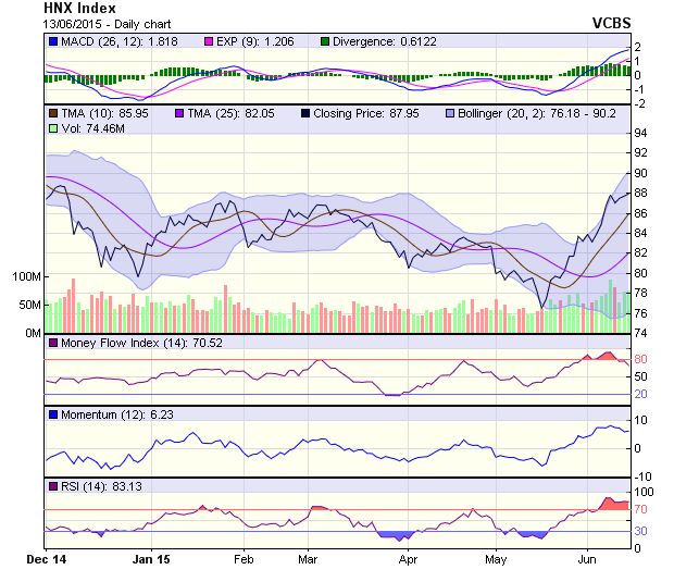 Về mặt kỹ thuật, cả hai chỉ số tiếp tục duy trì đà tăng điểm sau khi vượt các mốc kháng cự trung hạn tại 580 điểm đối với VN-Index và 87 điểm đối với HNX-Index. Trong phiên giao dịch 12/6, cả hai chỉ số đều có quá trình restest lại ngưỡng kháng cự cũ và tăng điểm trở lại cùng với thanh khoản duy trì ở mức cao. Thêm vào đó, dòng tiền tiếp tục luân chuyển giữa các nhóm cổ phiếu, nếu hôm 11/6 dòng tiền tập trung vào nhóm cổ phiếu bất động sản thì phiên 12/6 nhóm cổ phiếu chứng khoán lại là nhóm hút được tiền mạnh nhất.