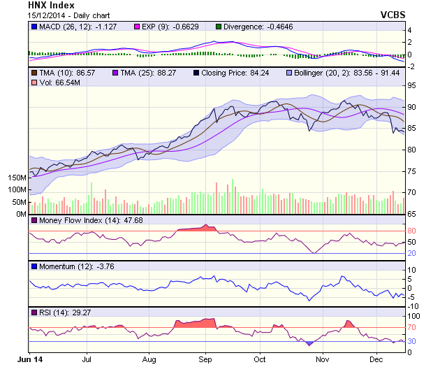 Đóng cửa phiên ngày 15/12 mất 0,31 điểm xuống 84,24 điểm, nhìn chung thị trường chưa thể lạc quan trở lại do áp lực bán ra còn hiện hữu khiến HNX-Index không thể giữ được đà hồi phục nhẹ từ phiên trước.