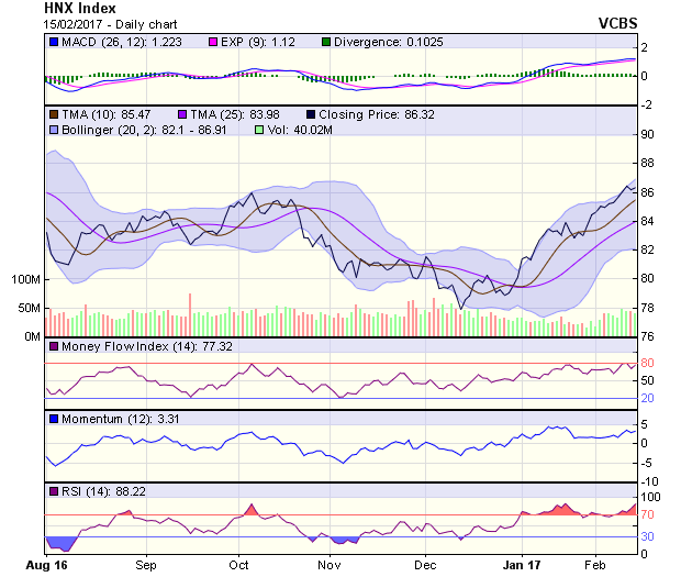 HNX-Index đang trong thị trường giá lên (bull market), với hỗ trợ gần nhất tại 82,9 điểm (MA200). Dự báo phiên 16/2, HNX-Index sẽ giảm điểm để kiểm nghiệm lại hỗ trợ gần nhất tại 86,1 điểm. Nếu lực cầu ở mức này là tốt, chỉ số có thể phục hồi từ đây để tiếp tục đi lên mục tiêu tiếp theo tại 87,1 điểm.