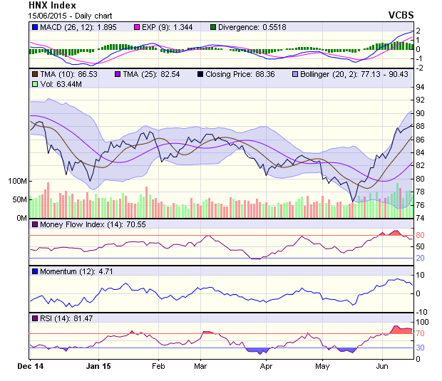 Về mặt kỹ thuật, cả hai chỉ số vẫn tiếp tục tăng điểm và vượt qua ngưỡng kháng cự quan trọng 585 điểm đối với VN-Index và 88 điểm đối với HNX-Index. Đây là một tín hiệu tích cực khi thị trường đang có diễn biến giằng co như phiên 15/6.