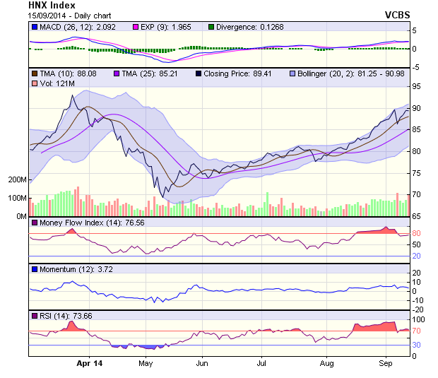 Chỉ số HNX-Index cho chỉ báo kĩ thuật khá xấu khi xuất hiện shooting star tại ngay ngưỡng cản 90 điểm. Tuy nhiên cần phiên giao dịch tiếp theo để khẳng định xu thế điều chỉnh trong ngắn hạn của chỉ số này sẽ diễn ra.