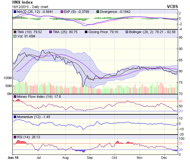 HNX-Index có phiên tăng điểm nhẹ, nhưng vẫn chưa vượt được middle bollinger band cũng như cận dưới của channel giảm điểm ngắn hạn, tạo thành một hammer với đuôi phía trên khá dài cho thấy, xung lực tăng điểm có xu hướng suy yếu trở lại. Mặc dù vậy, các chỉ báo kỹ thuật vẫn đang hỗ trợ tích cực cho đà tăng trong ngắn hạn. Mốc kháng cự mạnh trong ngắn hạn của HNX-Index là 80 điểm, trong khi mốc hỗ trợ là 78.5 điểm.