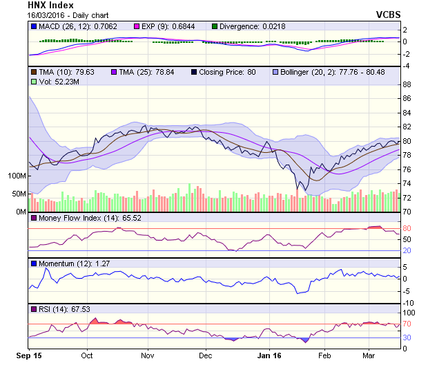 Mốc 80 điểm được HNX-Index lấy lại trong phiên 16/3. Về xu hướng ngắn hạn, chỉ số có thể tiếp tục vượt lên trên mốc này khi các tín hiệu ngắn hạn như RSI hay Stochastic Oscillators đã cho dấu hiệu tích cực trở lại. Tuy nhiên, đà tăng mạnh khó xảy ra khi mà thanh khoản vẫn chưa có sự đột phá nhất định.