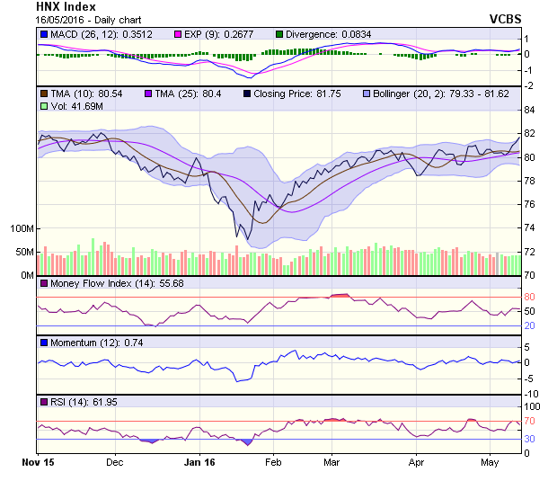 HNX-Index chốt phiên đầu tuần 16/5 bằng mức tăng 0,48 điểm lên đứng ở mốc 81,75 điểm. Nến tăng của HNX-Index với mức điểm đóng cửa ở khá gần với mức cao nhất trong phiên cho thấy đà tăng xuất hiện sớm và liên tục được tăng cường trong suốt thời gian giao dịch. Đây là một tín hiệu mang tính chất củng cố cho phiên breakout có được cuối tuần trước khi HNX-Index vượt qua mức kháng cự fibonacci 50,0% tại 61,16 điểm. Khối lượng giao dịch trong các phiên tăng liên tiếp không vượt qua được mức bình quân 20 phiên gần nhất nhưng duy trì khá đồng đều về giá trị. Qua đó, có thể nhận xét rằng xu hướng tăng giá của chỉ số đang có động lực khá ổn định mà chưa cần hỗ trợ từ dòng tiền bên ngoài.