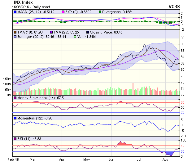 Về mặt xu hướng, mẫu hình nến đảo chiều “Three White Soldiers” xuất hiện ngày 11/08/2016 là một tín hiệu quan trọng được kỳ vọng sẽ giúp chỉ số kết thúc xu hướng giảm ngắn hạn từ đỉnh 682 điểm xuống 623 điểm. Đường MACD đang lao nhanh về ngưỡng 0 sau khi cắt lên trên đường tín hiệu, còn đường ADX cũng đã dần xác lập xu hướng tăng ở trên ngưỡng 25 trong sự phân kỳ của 2 đường DI. Những yếu tố này sẽ hỗ trợ cho diễn biến của chỉ số trong ngắn hạn.