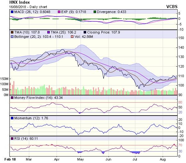 HNX-Index có diễn biến kém tích cực hơn. Chỉ số tiếp tục có phiên giảm điểm thứ hai liên tiếp, tuy nhiên, chỉ số vẫn duy trì đóng cửa trên MA 20, cho thấy xu hướng phục hồi ngắn hạn có thể là vẫn còn, phiên giảm điểm vừa qua có thể chỉ nằm trong đợt phục hồi kỹ thuật, ngưỡng hỗ trợ cho đợt điều chỉnh kỹ thuật này có thể là vùng 106,6 điểm (MA20).