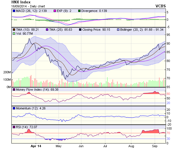 Trên sàn HNX, một vài điểm sáng trên phương diện kỹ thuật như nhóm các chỉ báo nhanh SO, MACD đồng thời giữ được nhịp tăng, hay RSI, DI cũng lập tức quay trở lại vị thế mua vào. Ở các phiên tới, HNX-Index sẽ cần duy trì tốt trên ngưỡng 90 điểm để có tiếp tục tiến lên các ngưỡng kháng cự cao hơn.