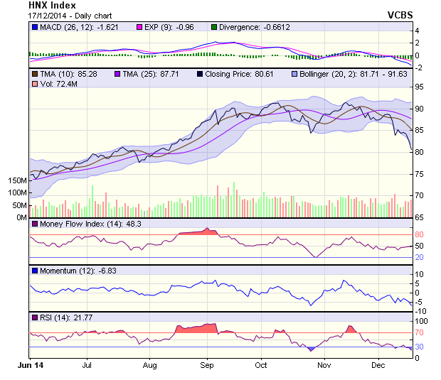 Đà giảm chưa có dấu hiệu dừng lại, HNX-Index để mất tới 2,02 điểm lùi về 80,61 điểm. Cây nến đỏ với bóng dài và liên tiếp lao dốc thể hiện thị trường đang nằm trong xu thế giảm với biên độ lớn. Sau một vài phiên giảm mạnh, HNX-Index đã lần lượt để mất các ngưỡng hỗ trợ trong ngắn, trung hạn cũng như cắt xuống dưới các đường trung bình dài hạn là những yếu tố khá bi quan. Trong tình huống xấu hơn, HNX-Index sẽ tiếp tục lùi xuống vùng đáy cũ ở khoảng 78 điểm.