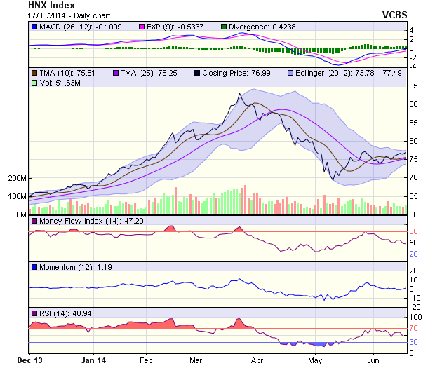 Các chỉ báo kỹ thuật vẫn tiếp tục cho tín hiệu đi ngang, đường cỏ MACD không có nhiều thay đổi so với phiên trước đó, đường ADX vẫn dao động dưới mức 20 cùng với sự suy giảm của MFI thể hiện trạng thái của dòng tiền vẫn ở mức thấp. HNX-Index tiếp tục dao động trong vùng 74-77 điểm, dãi Bollinger đang co hẹp lại cảnh báo đường giá sẽ sớm có sự thay đổi về xu hướng.