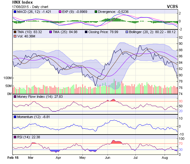 Độ rộng của nến đen mở rộng mạnh thể hiện áp lực bán có xu hướng tăng trở lại khi HNX-Index mất mốc hỗ trợ 80 điểm. Các chỉ báo kỹ thuật chưa xuất hiện tín hiệu đảo chiều nào, Stochastic, RSI vẫn cho trạng thái bán mạnh và đường xu hướng ADX tăng lên thể hiện xung lực của xu hướng giảm mạnh dần.
