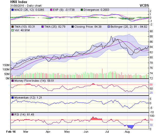 Khác với trạng thái giằng co bên sàn HOSE, HNX-Index tăng tích cực vượt kháng cự gần 84 điểm, hình thành cây nến xanh marubozu cắt MA50 và tiếp cận dải upper bollinger. Một số chỉ báo kỹ thuật cũng cho tín hiệu tích cực khi MACD hình thành lại xu hướng đi lên trên đường 0. Stochastic Oscillators đi vào vùng overbought. Hỗ trợ mạnh cho Hnx-Index nằm ở MA100. Vùng hỗ trợ 82-83 điểm. Vùng kháng cự 85 điểm.