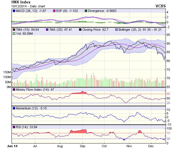 Sau phiên hồi phục 18/12, chỉ báo RSI(14) cũng đã tăng nhẹ, đạt 28.3, hướng trở lại về đường 30. Chỉ báo MFI(14) tăng thêm 7.3 điểm, đạt 45.9 điểm. Đường Stochatics phục hồi thoát khỏi vùng quá bán và chỉ báo chậm của nó, tín hiệu mua xuất hiện. Đường MACD và chỉ báo chậm giảm sâu hơn và chưa có dấu hiệu đảo chiều.