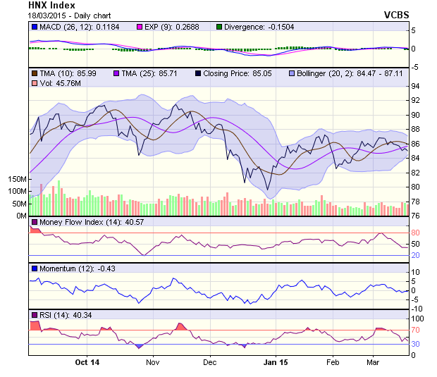 Đồ thị giá chỉ số HNX-Index tạo thành 1 Dragonfly với đuôi nến khá dài sau hàng loạt các phiên điều chỉnh giảm. Điều này cho thấy áp lực bán có phần suy giảm tại mốc hỗ trợ 85. Tuy vậy cần có phiên giao dịch tiếp theo để khẳng định về xu hướng đảo chiều. Đường Stochastic sau hàng loạt phiên rơi mạnh đã chững lại và có dấu hiệu đảo chiều tại vùng sát mốc Oversold. RSI cũng đi ngang sau giai đoạn giảm mạnh về dưới ngưỡng 50 cho thấy đà giảm đã có dấu hiệu suy yếu.