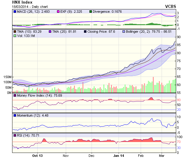 Các chỉ báo kỹ thuật tiếp tục cho tín hiệu tích cực về xu hướng tăng của HNX-Index. Khi HNX-Index bứt phá qua ngưỡng cản 85 điểm, mục tiêu tiếp theo của HNX-Index là vùng +/-100 điểm.