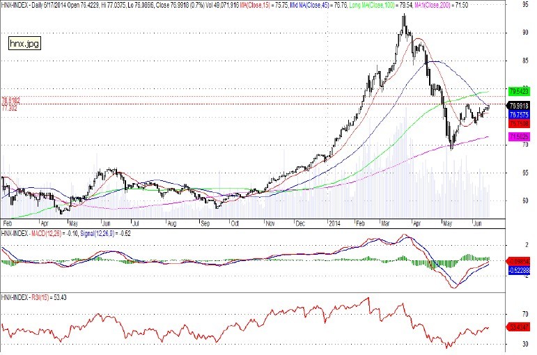 HNX-Index có phiên giảm nhẹ nhưng không tạo ra nến thấp hơn trong ngày 18/6. Đường giá hiện đang tiếp cận khu vực kháng cự78,2 điểm. Nếu vượt thành công kháng cự này, xu hướng của HNX-Index trong ngắn hạn sẽ chuyển sang tăng.