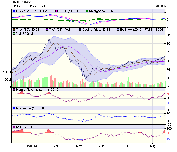Trên sàn HNX, đường giá hướng lên kết hợp cùng dải Bollinger mở rộng thể hiện xu thế khá lạc quan. Một vài chỉ báo cho tín hiệu tốt như RSI cắt lên ngưỡng 70, hay cặp DI mở rộng hay SO, Williams’ %R duy trì tốt trong vị thế mua vào. Ngưỡng kháng cự - hỗ trợ hiện tại của HNX-Index lần lượt là 81,5 – 84 điểm.