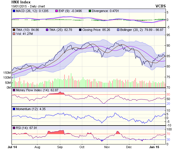 Trên đồ thị nến, HNX-Index vẫn trong quá trình dao động đi ngang trong biên độ hẹp và vẫn chưa đủ khả năng bứt phá khỏi ngưỡng cản 86 điểm. Với diễn biến giằng co này, cần tiếp tục quan sát thêm xem đường giá sẽ vượt được vùng sideway 84 - 86 điểm để xác định xu hướng mới. Các chỉ báo kỹ thuật không cho nhiều tín hiệu tích cực. RSI đi ngang quanh 50, MACD có xu hướng suy yếu trong khi đường -DI của ADX đang có xu hướng mạnh trở lại.