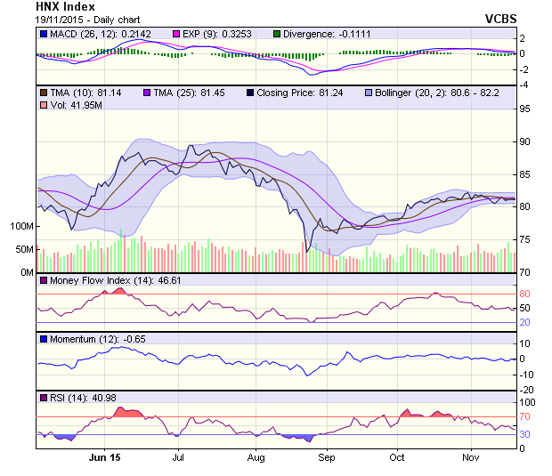 HNX-Index điều chỉnh giảm nhẹ trở lại sau 2 phiên tăng nhẹ trước đó. Diễn biến đi ngang trong biên độ hẹp của chỉ số này tiếp tục diễn ra. Các mẫu hình Doji, Spinning top liên tiếp hình thành và chưa có dấu hiệu chấm dứt xu hướng này trong ngắn hạn. Các chỉ báo kỹ thuật cũng đang suy yếu cho tín hiệu tiếp tục điều chỉnh giảm trong biên độ hẹp trong vài phiên tới.