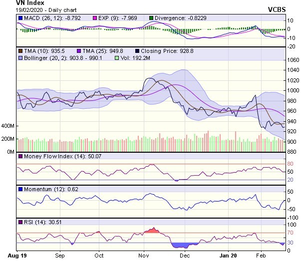 Phiên giảm điểm vừa qua có thể chỉ nằm trong một nhịp điều chỉnh kỹ thuật hướng về vùng hỗ trợ quanh 107 điểm (đỉnh tháng 7 và 11/2019), do áp lực chốt lời ngắn hạn khi chỉ số tiệm cận vùng kháng cự mạnh quanh 110,5-111,5 điểm (đỉnh tháng 3/2019).