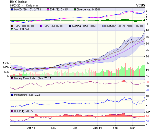 Trên đồ thị HNX-Index, chỉ số RSI14 tiếp tục tăng lên mức 82 điểm, tâm lý thị trường tích cực. MACD 9 ngày nới rộng khoảng cách phía trên đường tín hiệu, chỉ báo về xu hướng tăng giá.