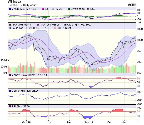 Điều này cảnh báo rủi ro thị trường có thể sẽ điều chỉnh trong một vài phiên kế tiếp. Trong trường hợp thị trường tiếp tục điều chỉnh, vùng 995-1005 và 970-980 sẽ là vùng hỗ trợ tích cực cho thị trường.
