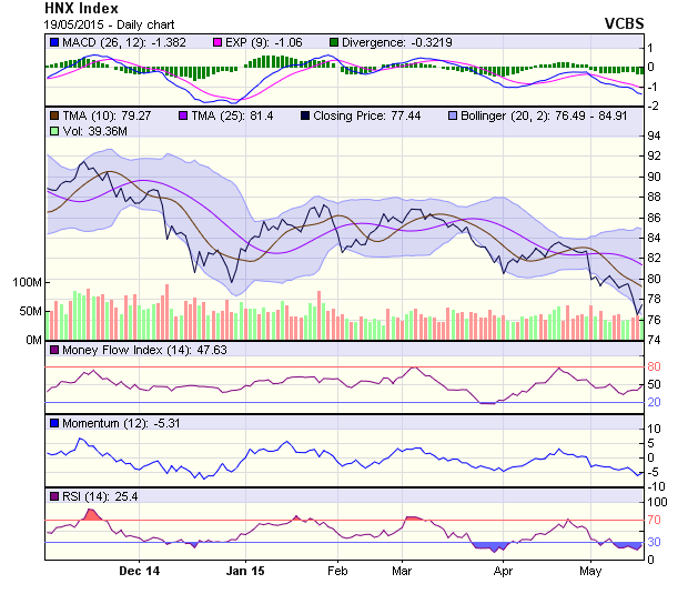 Chỉ số HNX-Index không cho tín hiệu đảo chiều sau phiên tăng trở lại 19/5, nến tăng lại có thân ngắn, thanh khoản không cải thiện và sẽ hướng tới các mốc cản 78 – 80 điểm trong các phiên sắp tới. Khả năng đảo chiều tăng điểm như vậy là khá thấp. Các chỉ bảo kỹ thuật cũng không cho nhiều tín hiệu cải thiện khi MACD tiếp tục suy yếu, duy trì dưới ngưỡng 0. Trong khi RSI vẫn đang trong vùng quá bán.