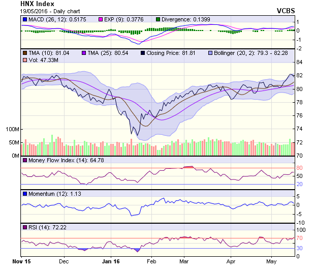 HNX-Index điều chỉnh giảm điểm khi xuất hiện áp lực chốt lời tại nhóm cổ phiếu trụ. RSI đã cắt lên phía trên đường 70, MACD tiếp tục cho tín hiệu đi lên. Xu hướng tăng nhiều khả năng được giữ vững. Ngưỡng hỗ trợ 81 điểm. Ngưỡng kháng cự 82,5 điểm.