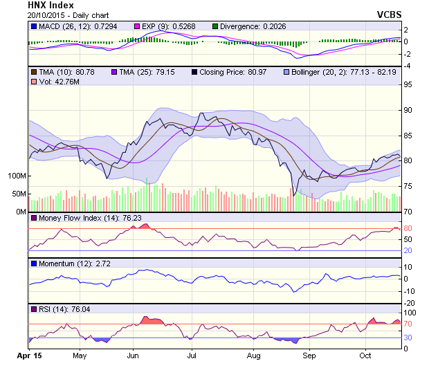 HNX-Index cũng điều chỉnh giảm nhẹ về sát mốc 80 điểm. Giao dịch trong biên độ hẹp tiếp tục diễn ra. Mặc dù vậy tín hiệu tiêu cực là RSI đang tạo phân kỳ với giá tại vùng overbought và đường MACD cũng đang cho tín hiệu điều chỉnh giảm trở lại. Mốc 80 điểm là mốc hỗ trợ ngắn hạn cho HNX-Index.