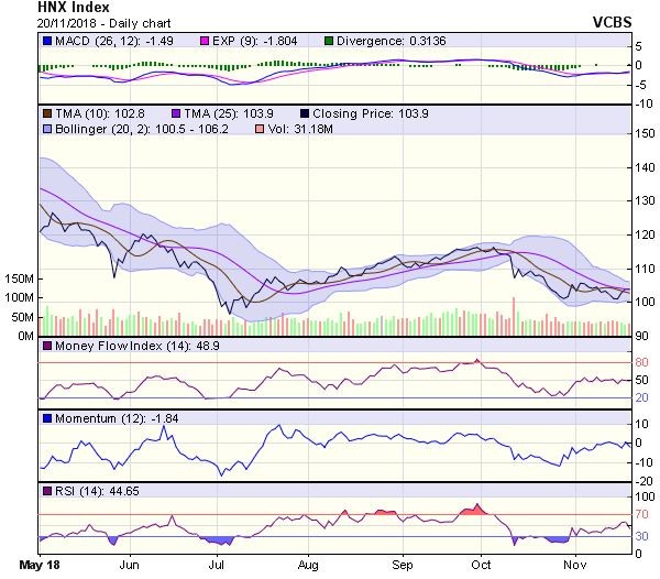 HNX-Index có diễn biến trái chiều trong phiên vừa qua. Chỉ số có phiên giảm điểm trở lại, nhưng vẫn duy trì đóng cửa trên MA20, cho thấy tín hiệu phục hồi ngắn hạn của chỉ số đang quay trở lại, ngưỡng kháng cự gần có thể là vùng 105,7 điểm (đỉnh tháng 11/2018).