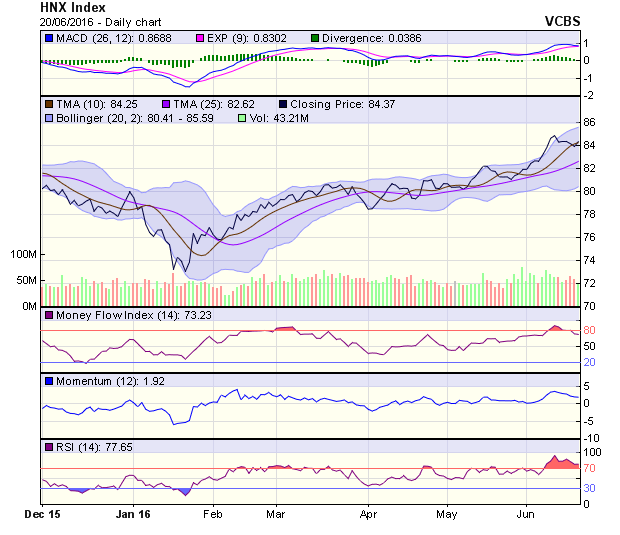 HNX-Index hình thành cây nến xanh rỗng cho thấy lực cầu quay trở lại sau 3 phiên giảm điểm liên tiếp. Thanh khoản tuy vậy khá thấp, chỉ đạt 43 triệu đơn vị. RSI hiện vẫn đang trong vùng overbought, MACD vẫn cho tín hiệu suy yếu, do vậy, rủi ro vẫn đang hiện hữu. Vùng hỗ trợ 83,5 điểm.