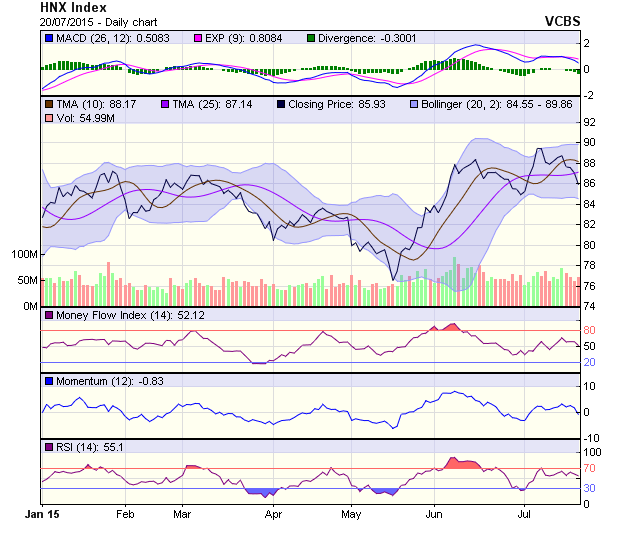 Sau khi cắt xuống dưới đường SMA20, HNX-Index đã nhận được sự hỗ trợ khá tốt từ vùng hỗ trợ được tạo bởi sự hội tụ của nhóm MA dài hạn và cận dưới của dải BB. Đây là một vùng hỗ trợ mạnh, vì vậy khả năng giảm sâu của chỉ số trong ngắn hạn là không cao. Đồng thời để ngỏ khả năng hồi phục của chỉ số tại vùng hỗ trợ này.