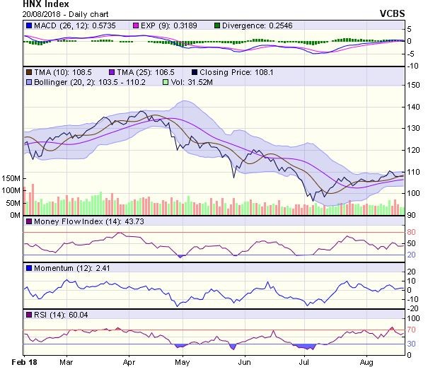 HNX-Index có diễn biến tương tự. Chỉ số có phiên tăng điểm thứ hai liên tiếp và duy trì đóng cửa trên MA20, cho thấy xu hướng phục hồi đang tiếp diễn, chỉ số có thể sớm tiến lên thử thách ngưỡng kháng cự 111,1 điểm.