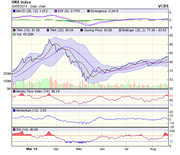 Trong phiên 21/8 chỉ số HNX-Index sẽ test lại ngưỡng cản 83.5, nếu dòng tiền tiếp tục hoạt động mạnh mẽ tại các nhóm cổ phiếu dầu khí, khả năng bứt phá của chỉ số này để hướng đến vùng 85 điểm là khá cao.