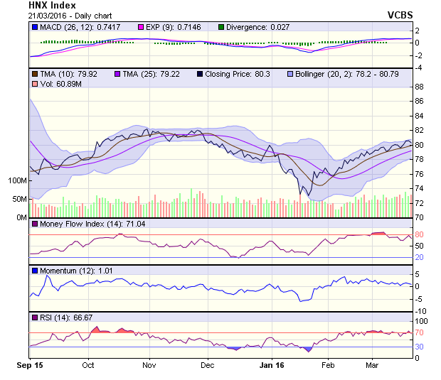 Đối với HNX-Index, mặc dù xu hướng chính vẫn đang là đi lên, nhưng sự xuất hiện của phiên điều chỉnh kèm khối lượng giao dịch tăng sẽ là nguyên nhân khiến biến động theo tuần của chỉ số này chứa đựng nhiều rủi ro đối với các danh mục ngắn hạn. Đồ thị nến của HNX-Index trong phiên 21/3 là một nến giảm có dạng spinning top, đây là hình mẫu phản ánh cung-cầu đang giằng co rất mạnh, bất chấp việc khung dao động của chỉ số đã được nâng lên mức 80-82 điểm.