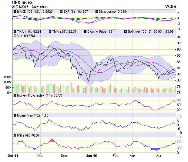 Chỉ số HNX-Index vẫn tiếp tục xu thế giao dịch trong biên độ khá hep và không cho nhiều tín hiệu cụ thể. Tuy vậy, vùng cản 84 – 86 điểm tạo ra bởi các đường SMA trung dài hạn đang tỏ ra khá vững chắc và chỉ số này có khả năng test lại mốc 82.5 điểm nếu xu hướng điều chỉnh mạnh dần lên. Các chỉ báo kỹ thuật có xu hướng suy yếu nhẹ sau 2 phiên giảm điểm. Tuy vậy, các chỉ báo này vẫn chưa cho tín hiệu cụ thể.