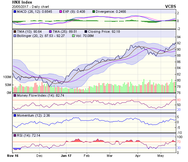 HNX-Index tăng điểm tuần thứ 4 liên tiếp, với mức tăng có xu hướng mạnh dần lên. Tín hiệu kỹ thuật trung hạn duy trì tích cực, với ngưỡng hỗ trợ tại 90,1 điểm (MA5-10) và kháng cự tại 94,5 điểm (đỉnh tháng 3/2014). Trong phiên 22/5, nhiều khả năng HNX-Index tiếp tục duy trì đà tăng điểm, với kháng cự gần nhất tại 92,6 điểm (đỉnh phiên 18/5) và vùng hỗ trợ trong khoảng 90,8-91,6 điểm.