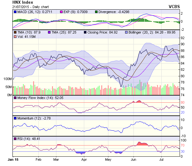 Đồ thị chỉ số HNX-Index tạo thành nến đen dài cho thấy áp lực điều chỉnh đang diễn ra khá mạnh. Tuy vậy, chỉ số vẫn đang duy trì trên vùng hỗ trợ ngắn hạn 84.5-85 điểm. Nếu tiếp tục phá vỡ vùng hỗ trợ này, khả năng HNX-Index sẽ điều chỉnh về mốc 82 điểm trong ngắn hạn. Các chỉ báo kỹ thuật cho tín hiệu xu hướng điều chỉnh ngắn hạn đang diễn ra mạnh khi đường RSI đang giảm dần về 30, trong khi đường +DI đã cắt xuống –DI cho tín hiệu đảo chiều giảm điểm.
