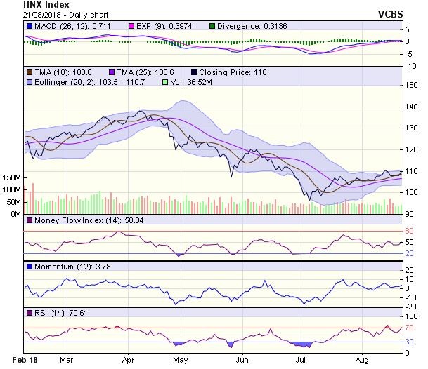 HNX-Index có diễn biến tương tự. Chỉ số có phiên tăng điểm thứ ba liên tiếp và duy trì đóng cửa trên MA20, cho thấy xu hướng phục hồi đang tiếp diễn, chỉ số có thể sớm tiến lên thử thách ngưỡng kháng cự 111,1 điểm.