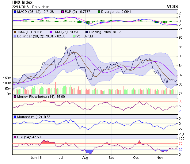 Xu hướng trong trung hạn vẫn ở mức tiêu cực, với kháng cự tại 81,3 điểm (MA20). HNX-Index tiếp tục ở trong thị trường giá xuống (bear market) với kháng cự tại MA200 ở mức 82,2 điểm, nên trong phiên 23/11, chỉ số này có thể là dao động trong biên độ 80,9- 81,3 điểm.