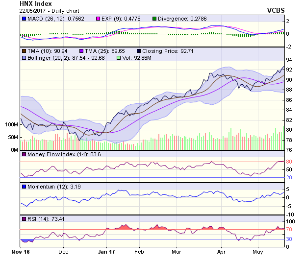 Dự báo phiên 23/5, nhiều khả năng HNX-Index sẽ tiếp tục tăng điểm, với kháng cự gần nhất là mốc tâm lý 94 điểm và hỗ trợ gần nhất của chỉ số tại 92 điểm.