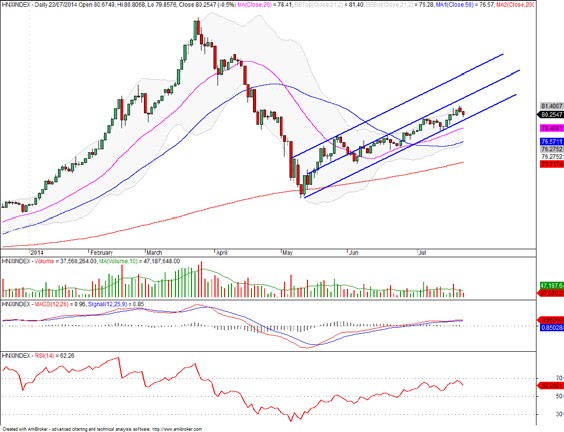 Trên đồ thị nến, HNX-Index đã có ba phiên không vượt qua hẳn ngưỡng 81 điểm, nhưng hai phiên giảm gần đây giá giảm nhưng thanh khoản ở mức thấp cho thấy áp lực bán cũng không mạnh, diễn biến này cũng phù hợp với độ dốc của đường khi diễn biến chậm và giằng co. Sau 2 phiên giảm nhẹ ngưỡng hỗ trợ của HNX-Index ở 80 điểm,