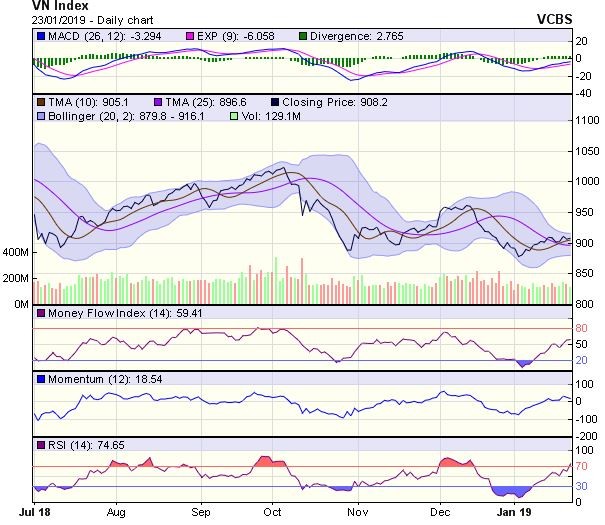 Dự báo, trong phiên giao dịch tiếp theo 24/1, VNIndex có thể sẽ tiếp tục giằng co với các nhịp tăng giảm đan xen trong biên độ 900-920 điểm (MA20-50), thanh khoản có thể sẽ vẫn thấp.