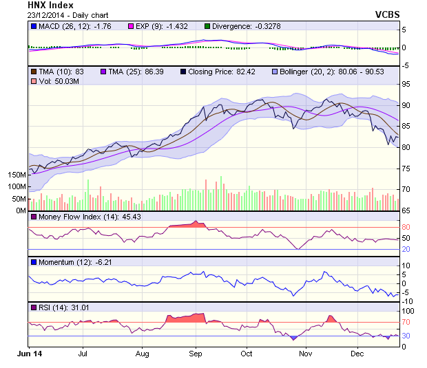 Trên sàn HNX,trạng thái của nhóm phương diện kỹ thuật không mấy khả quan cho thấy xu thế HNX-Index trong ngắn hạn vẫn chưa thể tích cực trở lại. Ngưỡng 80 điểm sẽ đóng vai trò là yếu tố nâng đỡ chính cho đường giá cho một vài phiên tới.