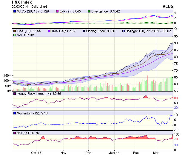Ngắn hạn, sau khi vượt qua vùng cản lại tại mức điểm 83-85, HNX-Index đang tiếp tục tăng mạnh.