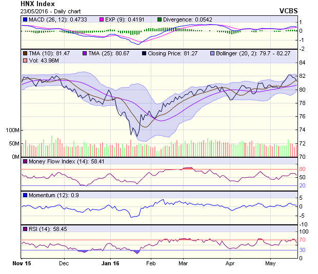 HNX-Index hình thành một cây nến đỏ đặc với thanh khoản tăng so với phiên 23/5. Đường giá không còn bám sát dải trên bollinger bands. RSI đã cắt xuống đường 70, MACD đang cho tín hiệu suy yếu. Vùng hỗ trợ 80-80,5 điểm. Vùng kháng cự 82 điểm.