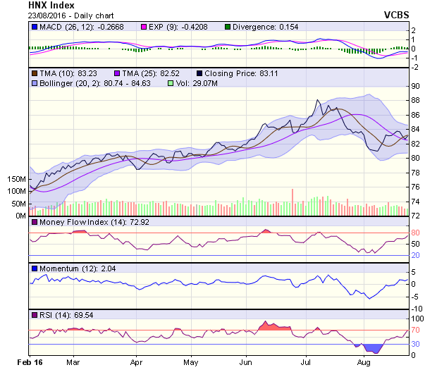 HNX-Index hình thành cây nến đỏ đặc, chạm đường MA20 và dải middle bollinger. Thanh khoản duy trì ở mức thấp. Một số chỉ báo kỹ thuật như RSI hay MACD tiếp tục cho tín hiệu không thật sự tích cực, như MACD đang cho tín hiệu bị suy yếu trên đường 0. Vùng hỗ trợ 82 điểm. Vùng kháng cự 84 điểm.