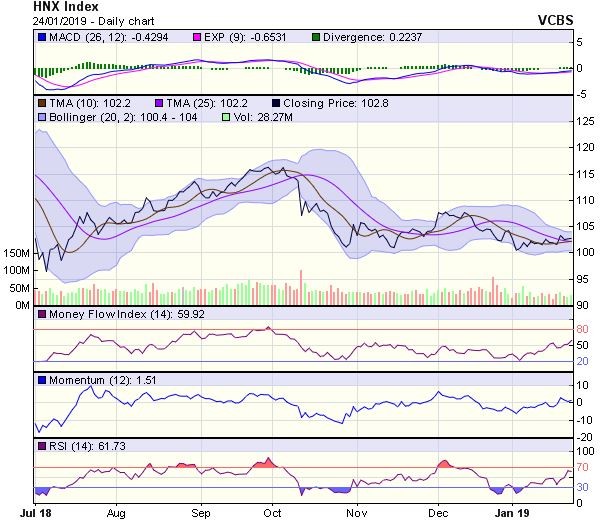 HNX-Index có diễn biến tương tự. Chỉ số tiếp tục vận động trên MA20, kèm theo MA5,10,20 đang có dấu hiệu hội tụ, cho thấy xu hướng tích lũy ngắn hạn của chỉ số có thể đang tiếp diễn.